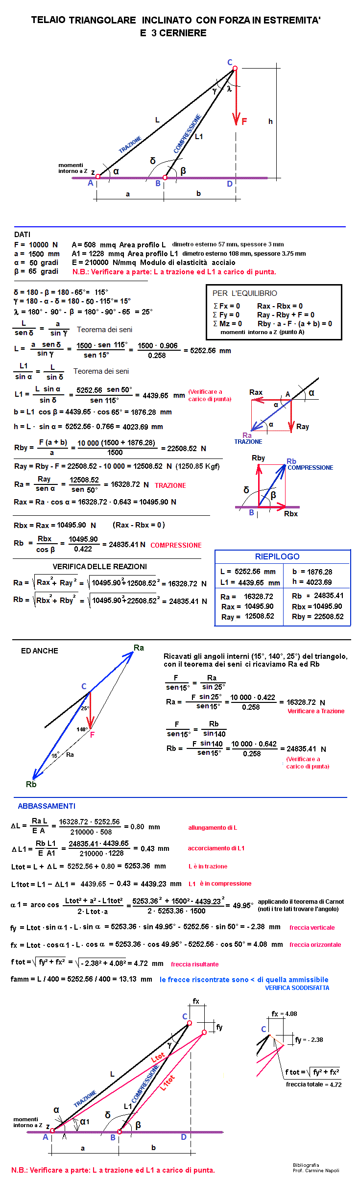Telaio triangolare inclinato con 3 cerniere e forza in sommità,